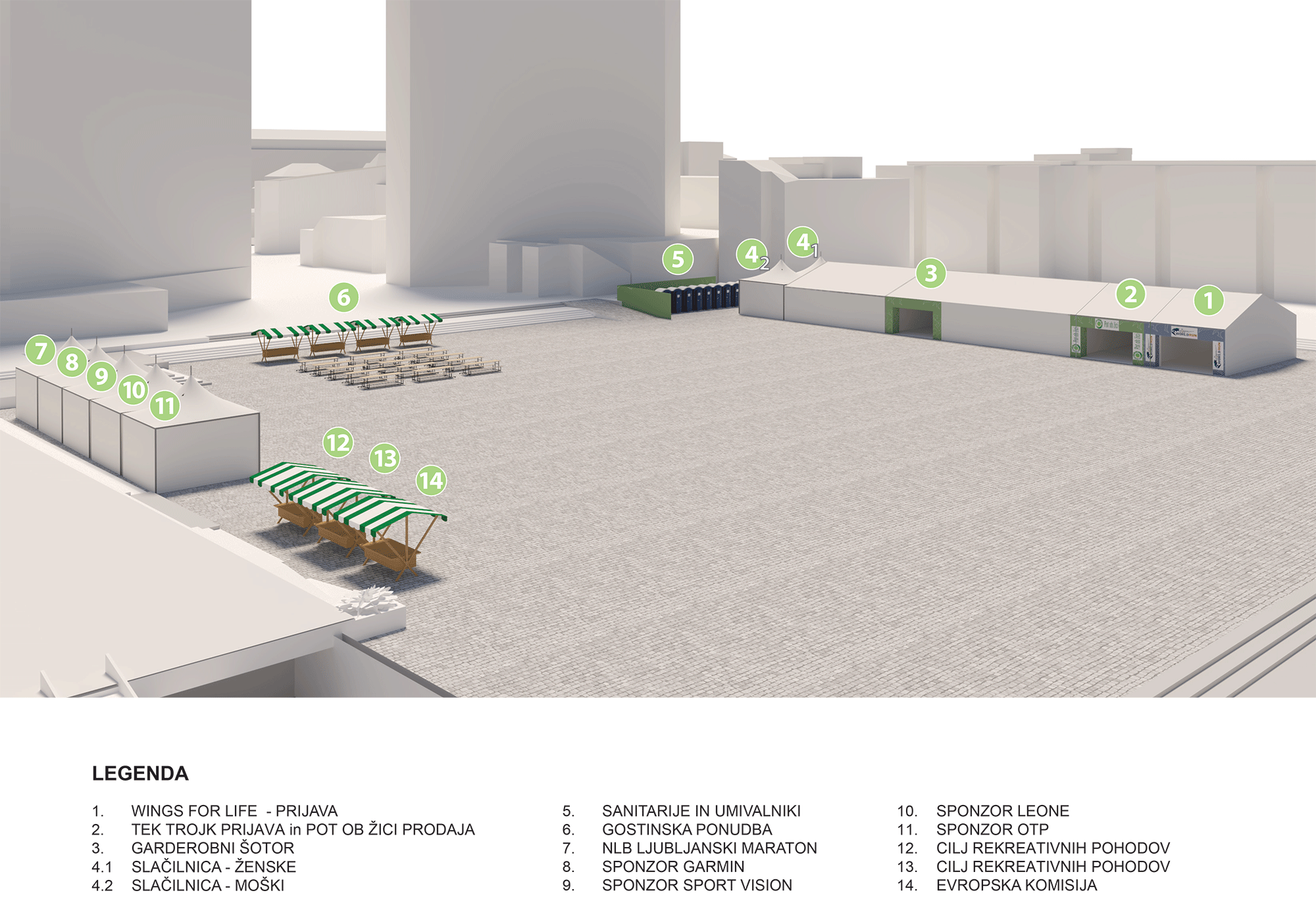 - Sanitarije bodo zagotovljene v plastičnih prenosnih WC-jih na Trgu republike in ob Stritarjevi ulici, ter na Kongresnem trgu.